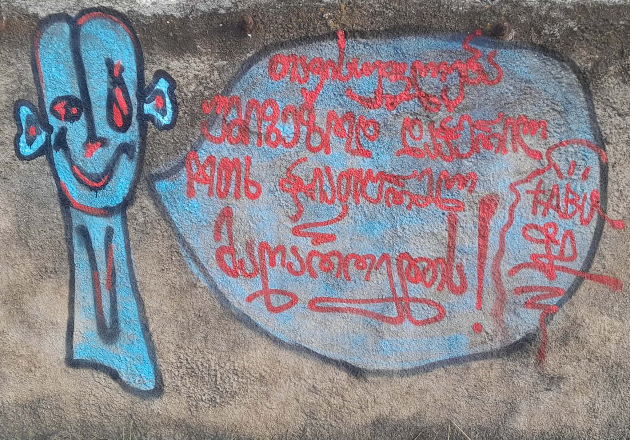 თავისუფლება უმიზეზოდ დაჭერილ ოთხ ჭიათურელ მაღაროელს! / ჩემი მორიგი წარწერა საკუთარ გრაფიტი პერსონაჟით უსამართლობის წინააღმდეგ.